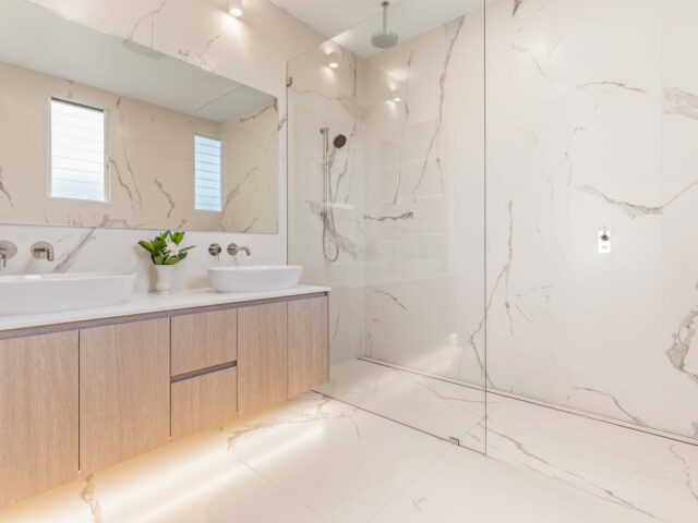• Elegant stone benchtops in the kitchen, bathrooms, and laundry areas