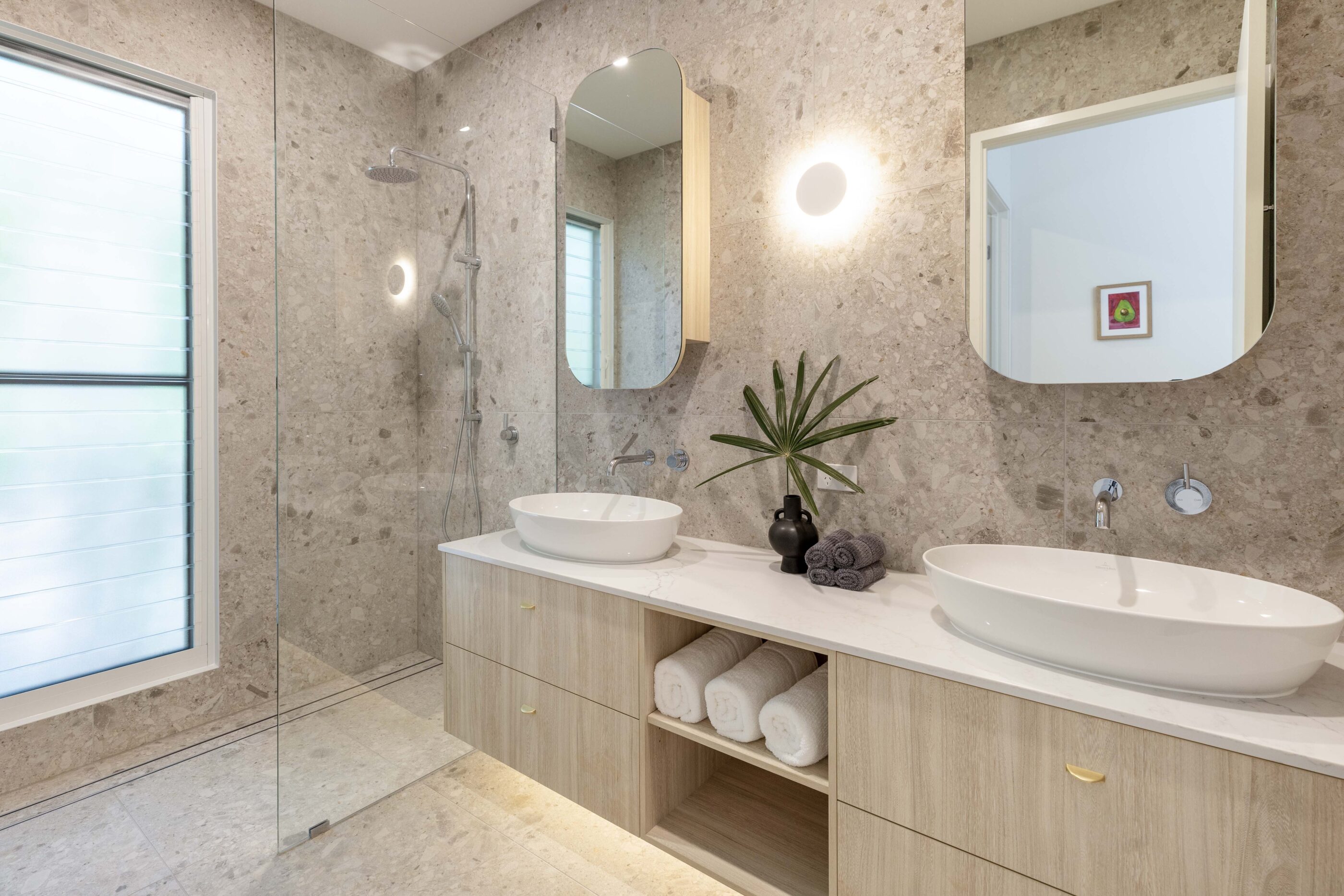 • Elegant stone benchtops beautify the kitchen, bathrooms, and laundry spaces.